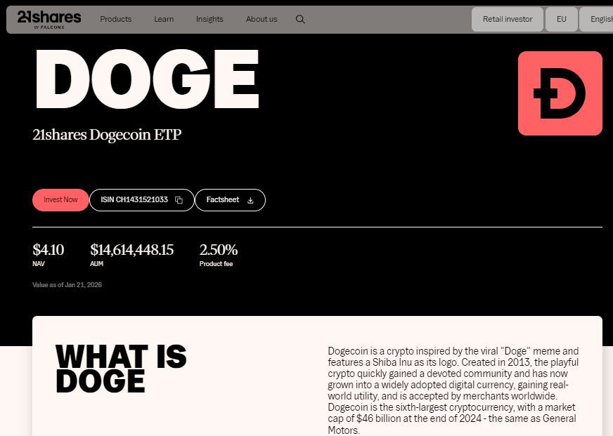В четверг 22.01.2026г. компания «21Shares» запустила первый спотовый ETF на DOGE, обеспеченный «Dogecoin Foundation».